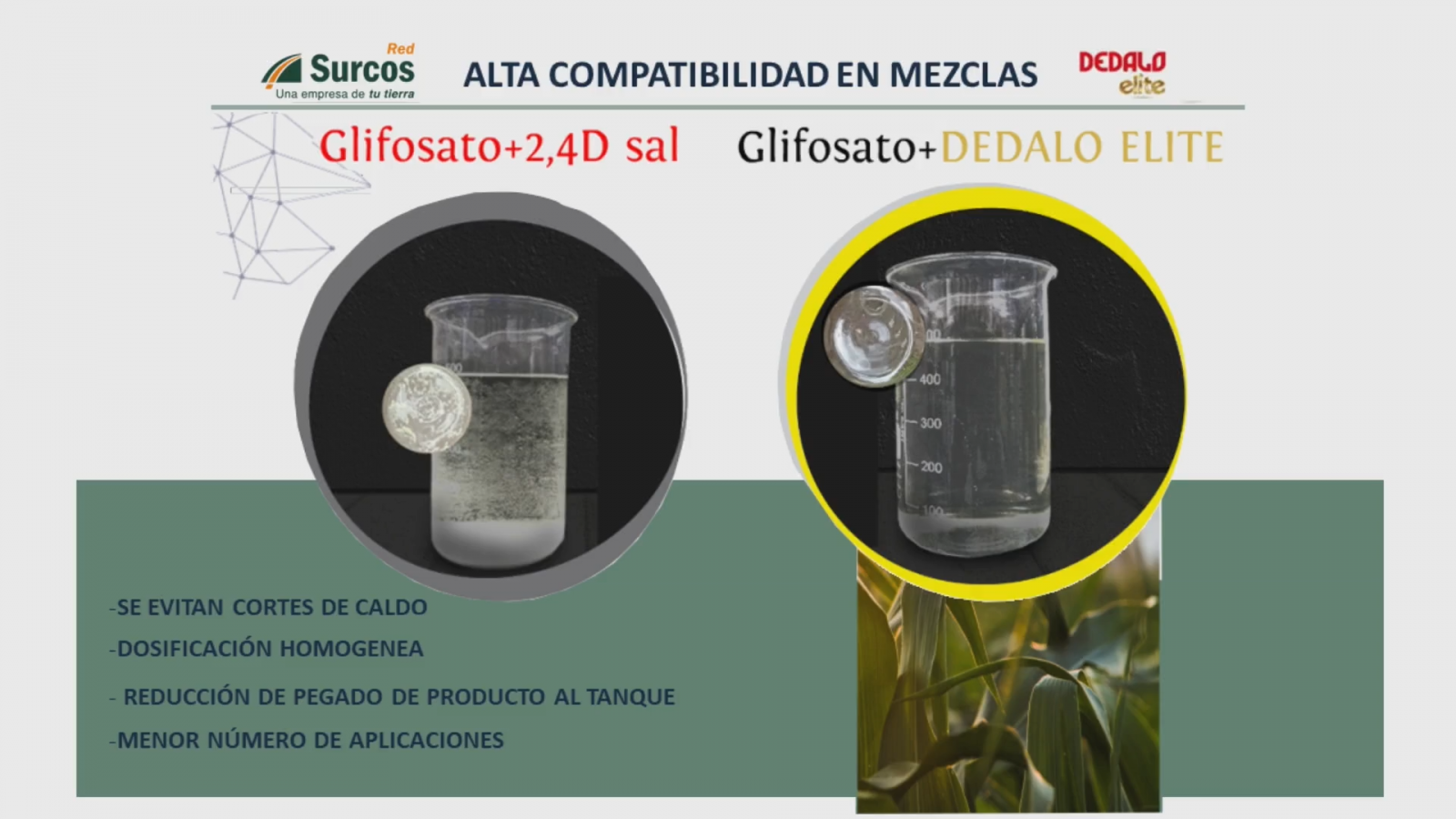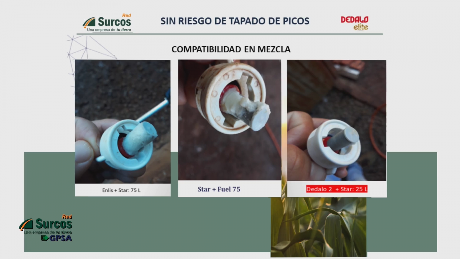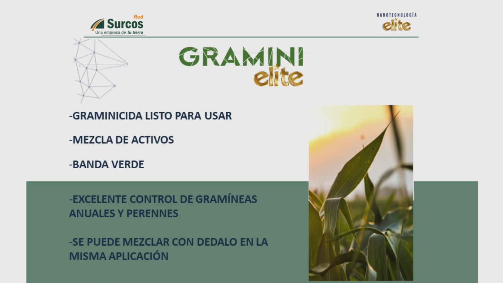 Durante la presentación Red Surcos presentó sus productos entre los que destacó: El Dedalo elite (2,4D 30% ME) para desecación, recomendado a una dosis de 1.200 cc/ha y el Cowboy elite (Dicamba 20% ME). Este producto posee una alta compatibilidad en mezcla y reducción de la volatibilidad, tiene un sinergismo con Dedalo elite en el control de malezas de hoja ancha reduciendo el rebrote de la coniza. También forma parte del portafolio el graminicida Apofis elite (Cl etodim 24% ME) y Gramini elite (Cletodim 12% +Haloxifop 6% ME) excelente para el control de gramíneas anuales y perennes y Orcuss elite (Haloxifop 25% ME).