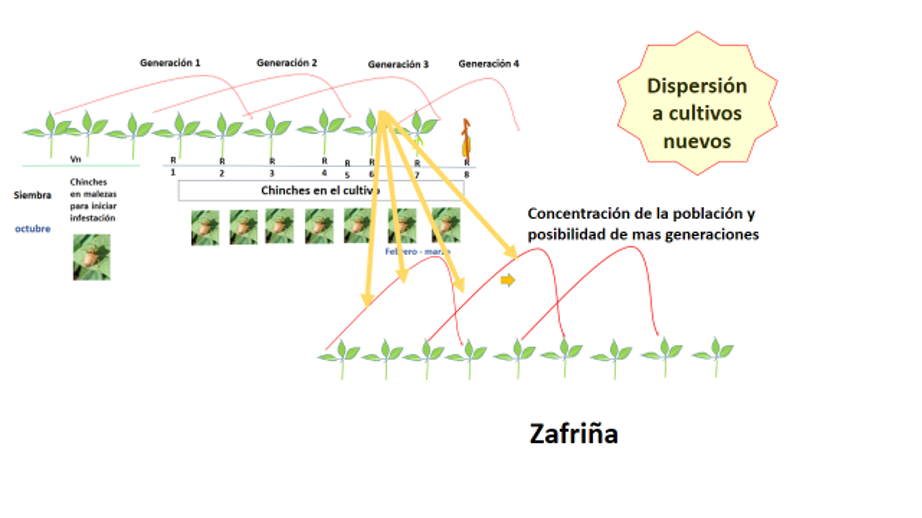 A pesar de realizar aplicaciones periódicas de insecticidas, las parcelas son reinfestadas muy rápidamente por adultos de las chinches provenientes de otras parcelas cercanas “poblaciones migrantes”, dando una secuencia a los daños en las mismas.