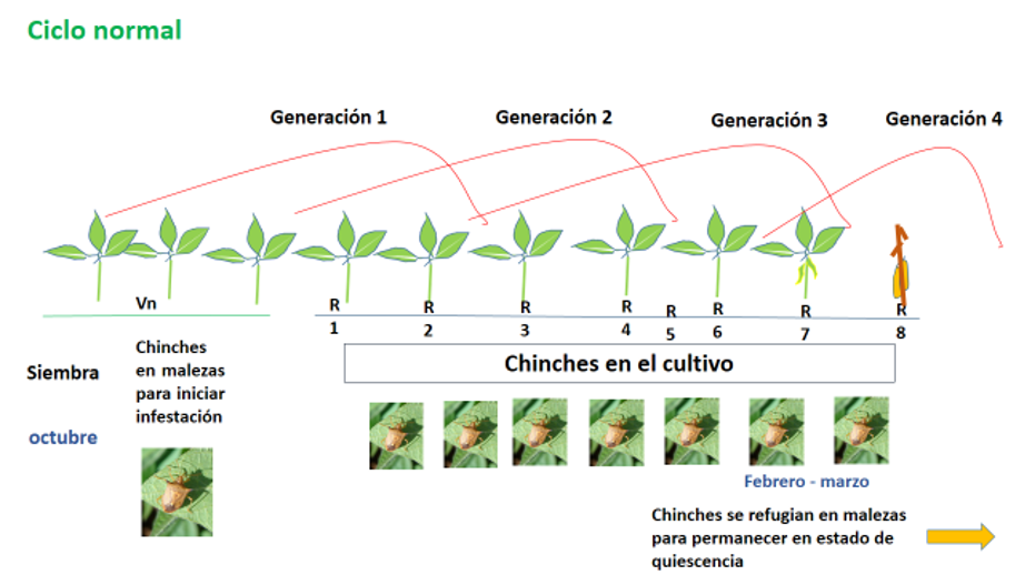 Existe una recomendación de siembra concentrada para el manejo de chinches; con la amplitud de siembra aumenta el número de generaciones y la población de insectos. Un punto a tener en cuenta a la hora de controlar estas chinches que vienen de otra parcela es que, las mismas ya fueron pulverizadas con el mismo principio activo; causando ya en ellas una presión de selección y quizá los individuos que llegan a infestar las nuevas parcelas ya estén adaptados (resistentes) al insecticida generando problemas mayores; esto es una de las razones por el cual se tiene mayor problema en soja de segunda zafra. Otro aspecto a tener en cuenta son las constantes y abundantes lluvias, los insecticidas aplicados podrán ser lavados fácilmente por el agua; perdiendo su eficacia a nivel de campo; el uso de coadyuvantes que complementa la penetración del producto en el follaje podrá ser un instrumento adicional que contribuya en la mejor acción del producto. Es importante realizar el monitoreo de chinches para verificar el grado de control de los mismos.