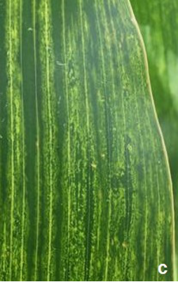 Figura 2. A) sintomatología del achaparramiento rojo del maíz, B) sintomatología del achaparramiento pálido del maíz y C) Sintomatología del ataque del virus del rayado fino del maíz.