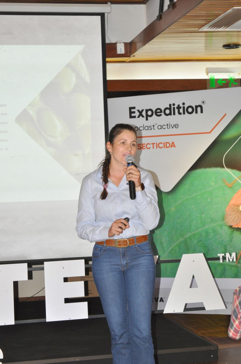 Instó igualmente a seguir con las recomendaciones técnicas y aprovechar los momentos adecuados y señalados para la aplicación, teniendo presente condiciones favorables para esta tarea. Finalmente, resaltó que el Quintal Xtra representa una excelente opción porque viene igualmente a integrar el esquema propuesto por Corteva Agriscience en cuanto a manejo de plagas se refiere y, por si fuera poco, con la ventaja de incluirse dentro de los grupos de defensivos etiquetados como los de “franja verde”, para su uso más amigable con el ambiente, puntualizó. A su turno, Daysi Bohn, desarrollista de Productos Comerciales y Precomerciales de la firma, abordó sobre el Expedition. Indicó que fue formulado pensando en el manejo de chinches, tanto el “marrón”, presente en la soja, como el de “barriga verde”, en el maíz. “En la soja es la principal plaga que afecta con daños directos e indirectos. De manera directa, succiona las proteínas de las vainas de soja que, si no se tiene la respuesta antes de llegar a estadíos superiores, los problemas serán mayores. Igualmente posee dos activos que permiten acción de choque y poder residual”.