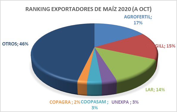 Ranking. Con base en los certificados de origen de la Ventanilla Única de Exportación (VUE), el ranking de mayores exportadores de maíz es encabezado por Agrofértil con un 17 % de participación. Luego, le siguen Cargill (15 %), LAR (14 %), Unexpa (2 %) Coopasam (2 %) y Copagra (2 %).