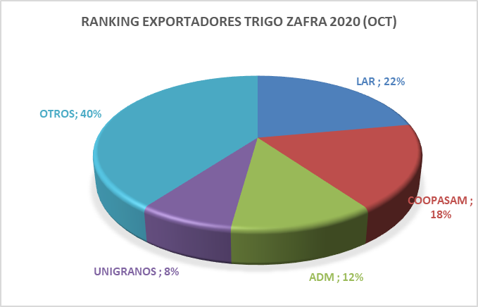 Ranking. El ranking de mayores exportadores de trigo es encabezado por la cooperativa LAR con un 22 % de participación, seguido de Coopasam con 18 %.