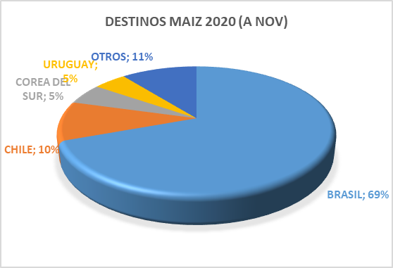 Destinos. Al cierre de noviembre, las exportaciones de maíz paraguayo tuvieron como mejor destino el vecino país de Brasil, en donde se concentró el 69 % de los envíos. En segunda posición se destaca Chile, con el 10 %. También aparecen Corea del Sur y Uruguay, con 5 % de cada uno de protagonismo. Otros mercados representan 11 % de preponderancia.