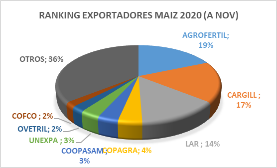 Ranking. Al cierre de noviembre, el ranking de mayores exportadores de maíz es encabezado por Agrofértil con un 19 % participación. Le sigue Cargill con un 17 %, LAR (14 %), Copagra (4 %), Coopasam (3 %), Unexpa (3 %), Ovetril (2 %), Cofco (2 %) y otros mercados con un 36 % de participación.