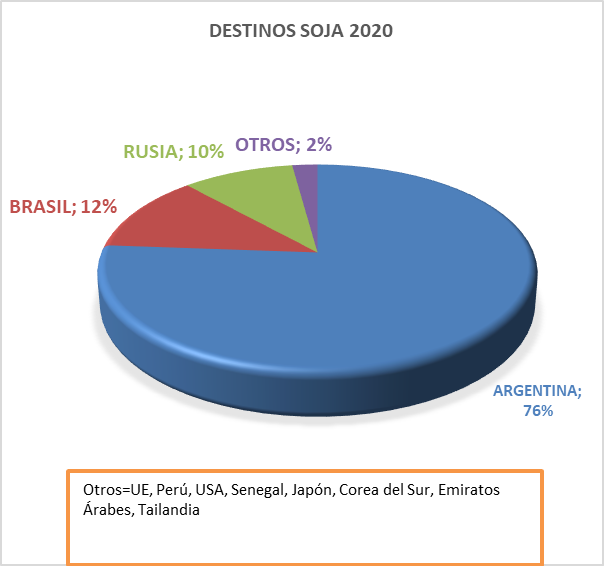 Destinos. El principal destino de la soja paraguaya fue Argentina, con un 76 % de participación, que representó un total de 4,93 millones de toneladas exportadas durante el 2020 al vecino país. El gran crecimiento se dio en Brasil, que tuvo un protagonismo del 12 % al adquirir 783