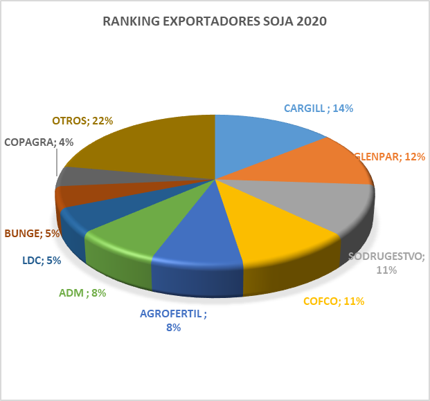 Ranking. La empresa Cargill terminó el 2020 liderando el ranking de mayores exportadores de soja, con un 14 % de participación. En la segunda ubicación quedó Glenpar con 12 % de protagonismo. Luego, Sodrugestvo (11 %), Cofco (11), Agrofértil (8 %), ADM (8 %), LDC (5 %), Bunge (5 %), Copagra (4 %) y otros jugadores que representan el 22 % del total.
