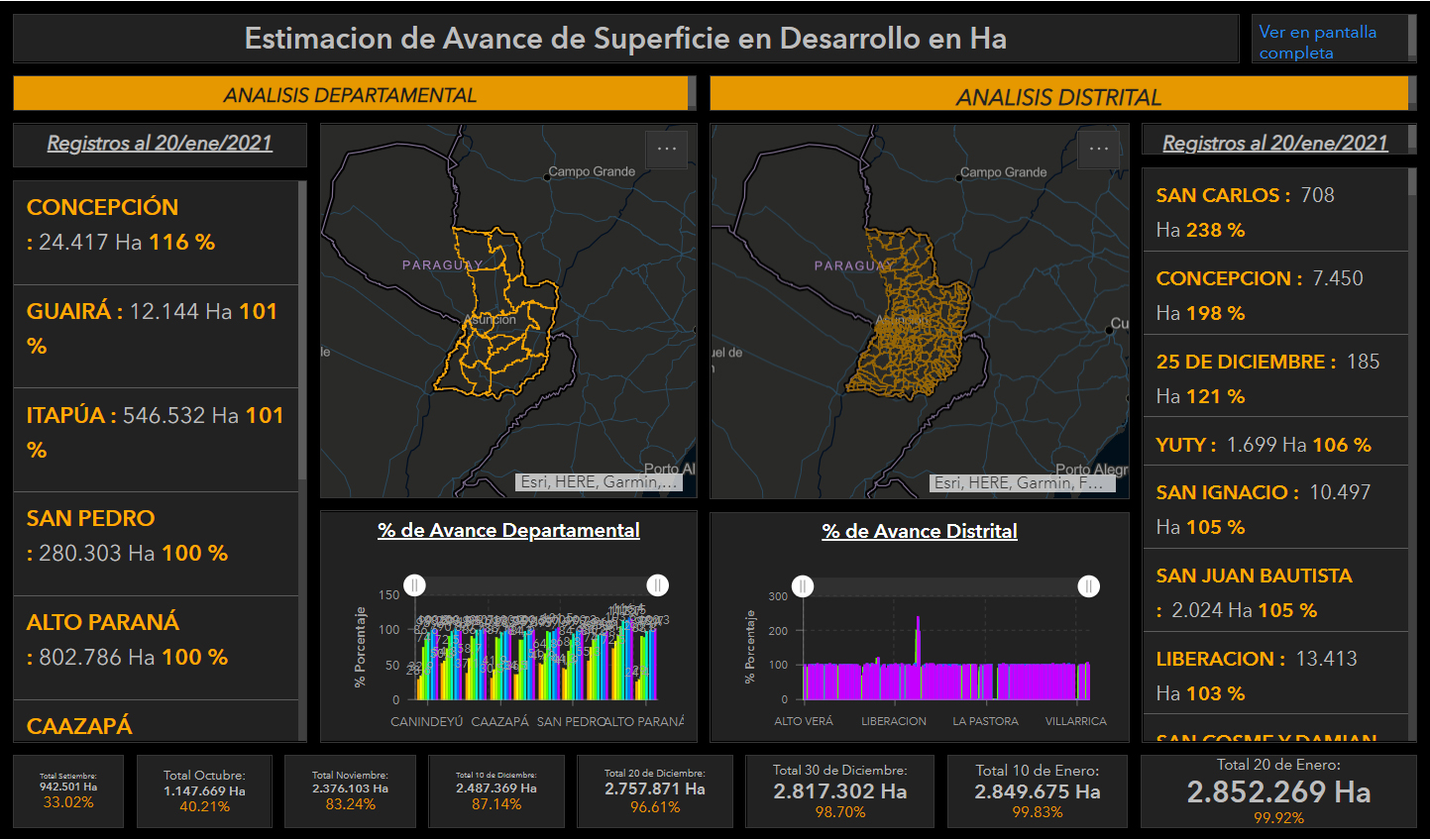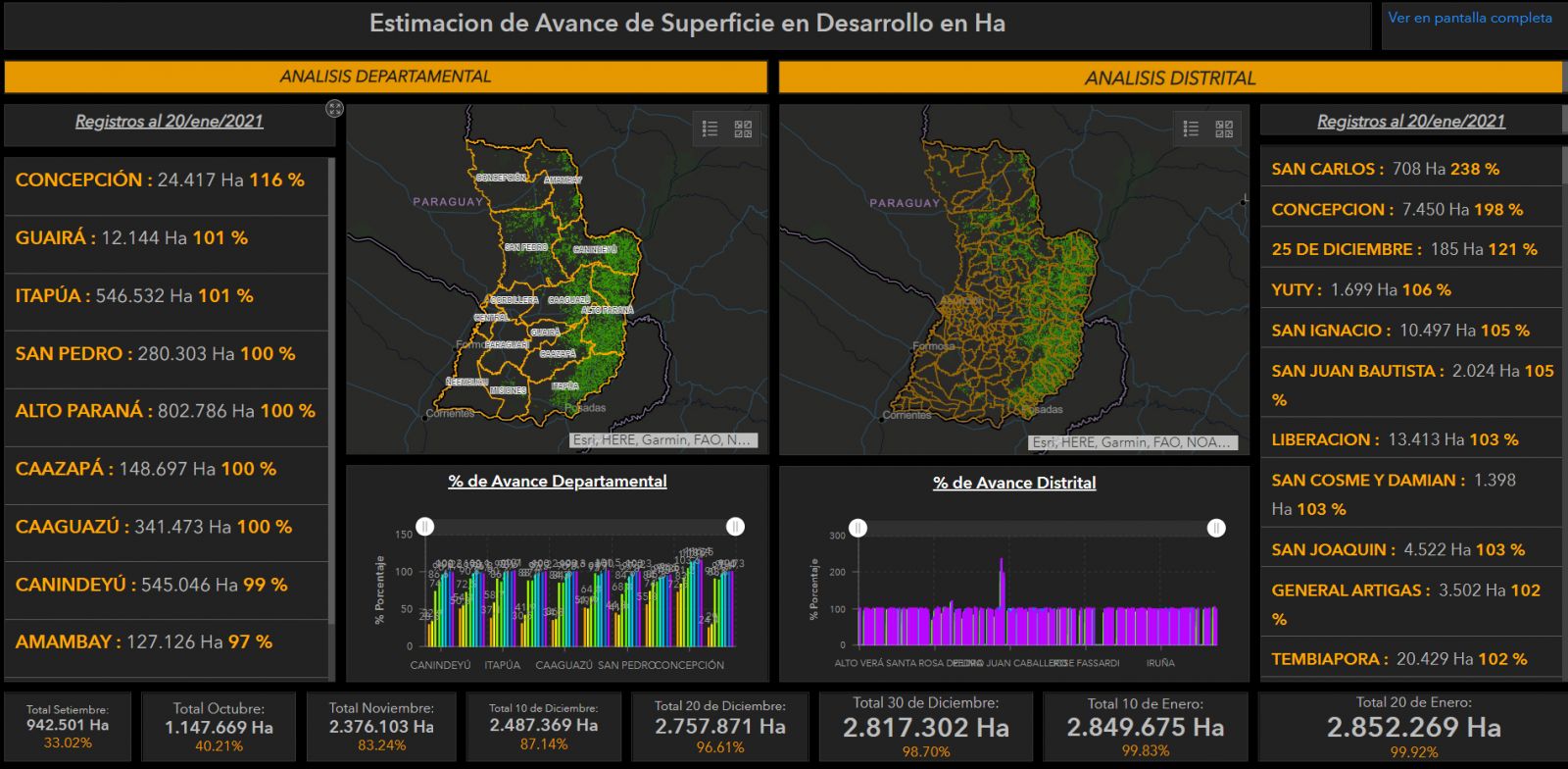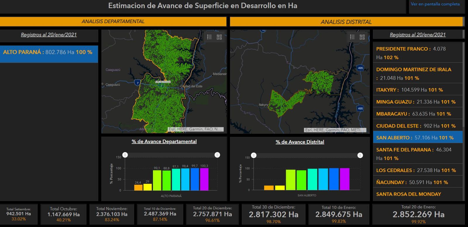 En la última imagen podemos ver el avance porcentual de superficie de soja zafra para el distrito de San Alberto (Alto Paraná), acompañado del mapa de ubicación de los cultivos de soja zafra el distrito y el departamento.