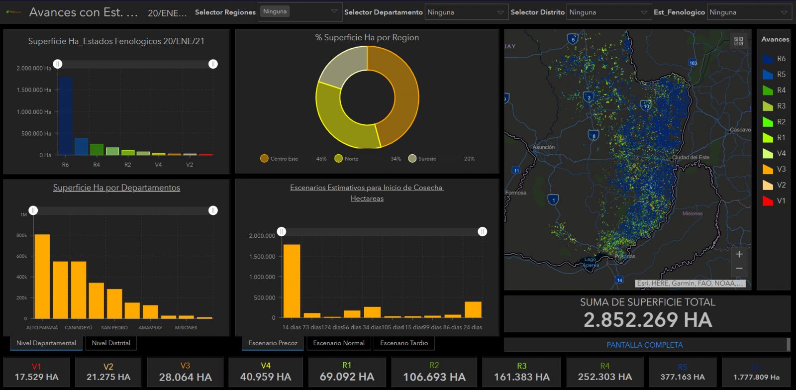 Los cultivos de soja en gran parte, se encuentran en estados R6 (1.777.809 ha.) y R5 (377.163 ha.), indicando la aproximación a sus fechas de cosecha, que a diferencia del año pasado en estas instancias los cultivos se encontraban en plena cosecha, la coyuntura actual y los factores climáticos (sequia) influyeron retrasos en las diversas regiones del país con un retraso en las etapas de esta zafra.