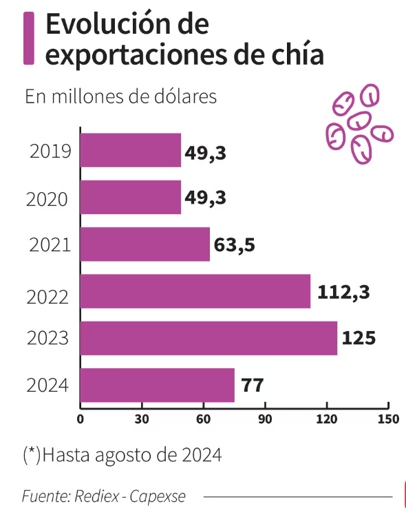 “Con los números, actualmente como veo, vamos a seguir liderando la provisión de chía en el mundo. Aún quedan casi 3 meses y estos números están orillando lo que fue la facturación del año pasado. Son 75 millones de dólares y el año pasado estuvo en más de 110 millones de dólares. En esta recta final del año consideramos que estaremos llegando a ese número”, expresó Gilberto Ozorio, presidente del gremio.