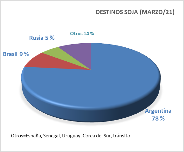 Destinos. Argentina sigue ocupando la principal plaza de destinos de la soja paraguaya. El vecino país representa el 78 % de la torta, mientras que Brasil lo sigue secundando con un 9 %. En tercer lugar aparece Rusia con un 5 % y el resto de los mercados representa el 14 %. En el informe también se hizo referencia a envíos a otros destinos como España, Senegal, Uruguay y Corea del Sur.
