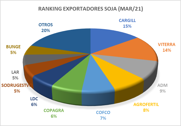 Ranking. El ranking de exportadores es liderado por la empresa Cargill con un 15 % de participación. Le siguen Viterra y ADM con 14 % y 9 %, respectivamente. También aparecen Agrofértil (8 %), Cofco (7 %), Copagra (6 %), LDC (6 %), Sodrugestvo (5 %), LAR (5 %), Bunge (5 %) y otros exponentes que representan 20 %.