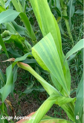 Figura 2. A) sintomatología del achaparramiento rojo del maíz, B) sintomatología del achaparramiento pálido del maíz y C) Sintomatología del ataque del virus del rayado fino del maíz.