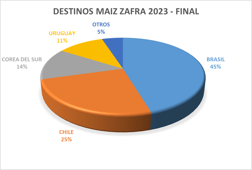 Destinos. Brasil se volvió a posicionar como el principal destino con el 45 % del total embarcado. Le siguen por Chile (25 %), Corea del Sur (14 %), Uruguay (11 %), y otros destinos como Perú, Vietnam, Japón, Mauricio, Camerún, Arabia Saudita, Senegal, Cabo Verde y Colombia, con lo cual se observa una gran diversificación de los destinos.