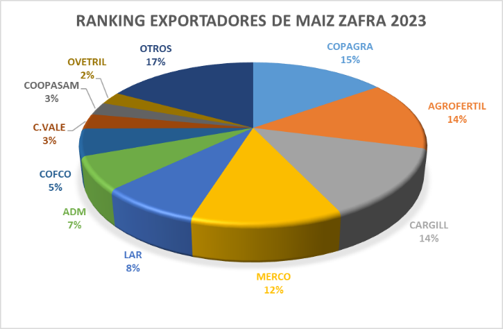 Copagra lidera la lista con el 15 % de participación, seguida por Agrofértil y Cargill (14 %), Merco (12 %), LAR (8 %), ADM (7 %), Cofco (5 %) entre otros.