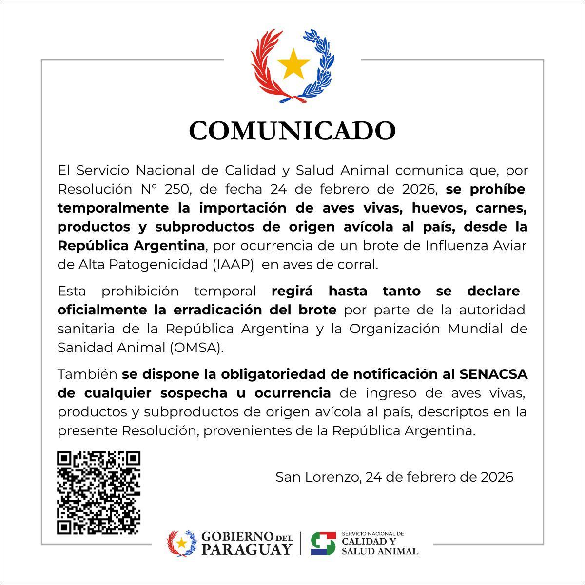 Desde la institución señalaron que Paraguay mantiene su condición sanitaria y que el sistema de vigilancia epidemiológica se encuentra en alerta permanente, reforzando los controles en puntos de ingreso al país. Asimismo, recordaron que estas medidas buscan evitar riesgos para la producción local y proteger la cadena avícola nacional.