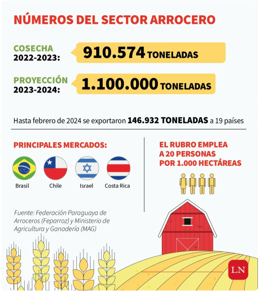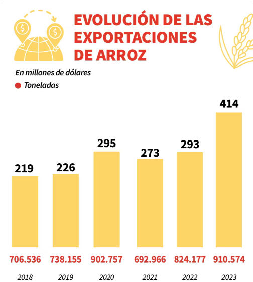 Según datos del Banco Central del Paraguay (BCP), Paraguay exportó 824.177 toneladas en el 2022 por un valor de USD 293,8 millones y 910.574 toneladas en el 2023 por USD 414,8 millones. Las expectativas para esta campaña 2023-2024 es de más de 1.100.000 toneladas. Hasta febrero de este año se exportaron 146.932 toneladas de arroz a 19 países.