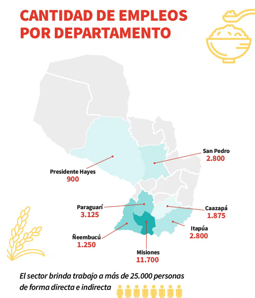 Teniendo en cuenta que en Paraguay se cosecha y produce arroz en aproximadamente 175.000 hectáreas, el rubro da trabajo de forma directa e indirecta a más de 25.000 personas. La cantidad de empleo por departamento es la siguiente: Presidente Hayes (900), Ñeembucú (1.250), Caazapá (1.875), Itapúa y San Pedro (2.800), Paraguarí (3.125) y Misiones (11.700). “El sector arrocero emplea mucha mano de obra, esto es importante destacar”.