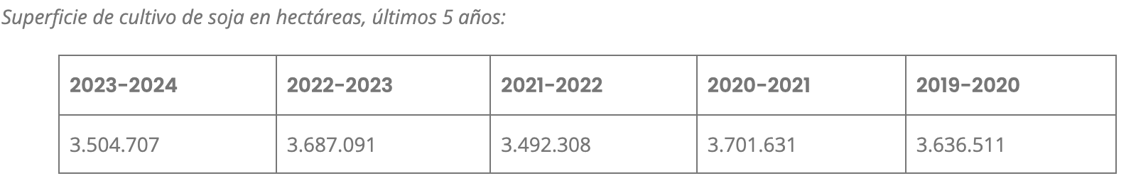 Según el informe del INBIO, la disminución en el área de siembra de soja en la zafra 2023-2024 fue de 182.384 hectáreas, poco menos que el 5%. El área total del cultivo de soja fue de 3.504.707 hectáreas, en tanto que en la zafra 2022-2023, la superficie fue de 3.687.091, teniendo un incremento significativo con relación a la zafra del 2021-2022, que fue 3.492.308 hectáreas, luego de la gran sequía. Hasta ahora la zafra con mayor área de siembra de soja fue la de 2020-2021, cuando la superficie alcanzó las 3.701.631 hectáreas.