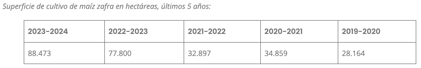 Respecto al área de superficie dedicada al cultivo de maíz, el informe del INBIO señala que en la zafra 2023-2024, el área destinada fue de 88.473 hectáreas, teniendo un crecimiento de la superficie en unas 10.673 hectáreas con relación al año anterior, cuando la superficie del cultivo alcanzó unas 77.800 hectáreas. El incremento del área de maíz fue del 12%, este cultivo viene teniendo un significativo ascenso, ya que en la zafra 2021-2022 tuvo solo un área destinada de 32.897 hectáreas.
