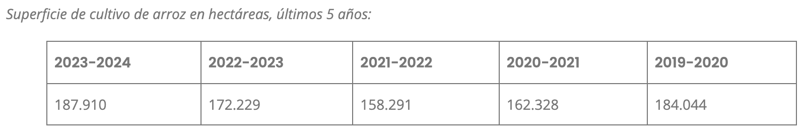 En cuanto al área de siembra de arroz en la zafra 2023-2024, el informe revela que la superficie fue de 187.910 hectáreas, unas 15.681 hectáreas más que el año anterior, cuando la superficie había alcanzado las 172.229 hectáreas. Este cultivo también viene teniendo un incremento en su área, ya que en la campaña 2021-2022  alcanzó unas 158.291 hectáreas.