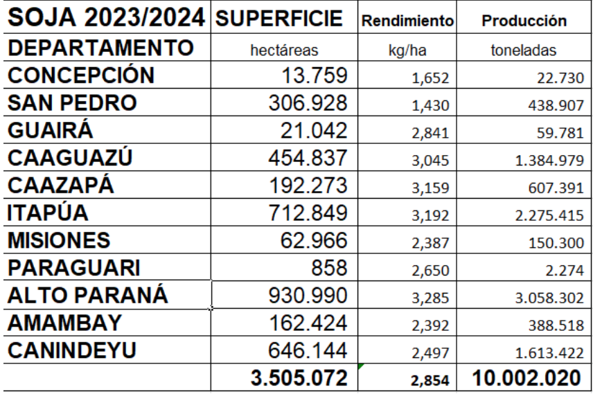 El ingeniero Agrónomo Héctor Cristaldo, presidente de la Unión de Gremios de la Producción (UGP), dio detalles del rendimiento del cultivo de la soja en la zafra 2023-2024, donde se destaca un rendimiento general de la Región Oriental de 10.020.020 toneladas, siendo el rendimiento promedio de todos los departamentos de 2.854 kilos por hectárea. Dijo que los datos presentados fueron elaborados con base en informaciones proporcionadas por fuentes confiables como productores, empresas y cooperativas, entre otras.