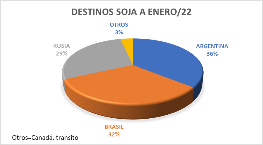 Destinos. En lo que se refiere a destinos de la soja nacional, Argentina se siguió posicionando como el mercado más importante (36 % de participación), tras los envíos de 78.500 toneladas. Cabe aclarar que estos envíos son remanentes de contratos de la zafra 2020/21.