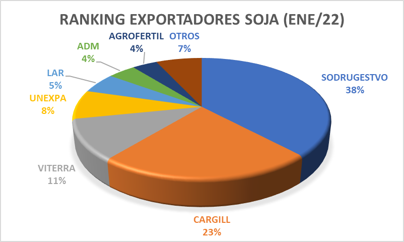 Ranking. Con relación al ranking de exportadores, Sodrugestvo encabezó el listado con el 38 % del total de granos enviados al inicio del 2022. Más atrás le siguieron Cargill (23 %), Viterra (11 %), Unexpa (8 %), Lar (5 %) y otros empresas más.