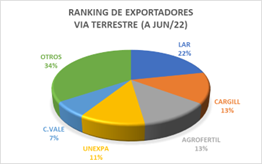 Por otro lado, LAR se sigue posicionando como líder de las exportaciones terrestres, pues registró una participación del 22 %. Completaron el listado Cargill (13 %), Agrofértil (13 %), Unexpa (11 %) y otros.