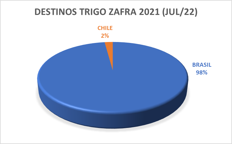 Destinos. Hasta julio de 2022 Brasil siguió siendo el principal destino del trigo paraguayo con el 98 % de participación. En tanto, Chile, que se encuentra aumentando su demanda, representa el 2 % restante.