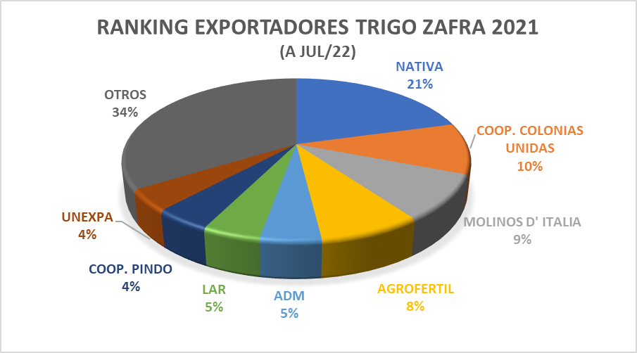 Exportadores. En cuanto al ranking de exportadores, Nativa se encuentra como el líder de todas las empresas a julio de 2022, con el 21 % de participación. Le siguen la Cooperativa Colonias Unidas (10 %), Molinos D' Italia (9 %), Agrofértil (8 %), ADM (5 %), LAR (5 %), Cooperativa Pindó (4 %), Unexpa (4 %), entre otros.