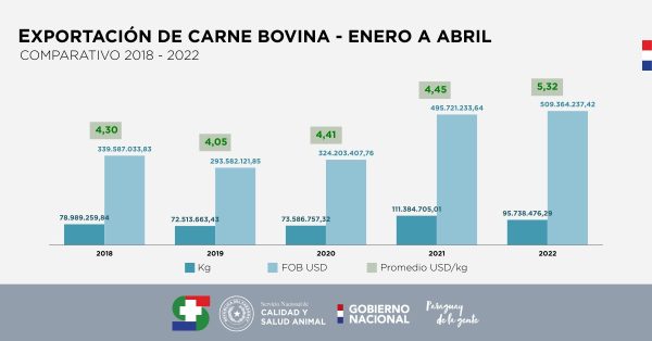 En los primeros cuatro meses del presente año, las exportaciones de carne bovina alcanzaron 95.738.476,29 kilos del producto, por un valor de 509.364.237 dólares, según datos revelados en el reporte del servicio veterinario oficial.