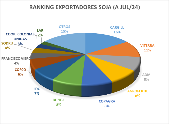 Ranking. El ranking de exportadores no ha variado mucho con relación al mes anterior, ya que Cargill sigue liderándolo con el 16% de participación, seguido por Viterra (11%), ADM, Agrofértil, Copagra y Bunge (8%) y LDC (7%), entre otros.