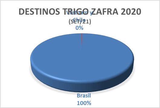 Al cierre del mes de setiembre se cerraron las exportaciones de trigo, correspondiente a la zafra 2020 y se da lugar a los envíos de la zafra 2021, recientemente cosechada. En este ciclo de exportación que concluye, que comprende de octubre 2020 a setiembre de 2021 se exportaron 362 123 toneladas del cereal, frente a las 330 489 toneladas enviadas en el mismo periodo de la temporada pasada; es decir, en este último lapso se desalijaron 8,7 % más.